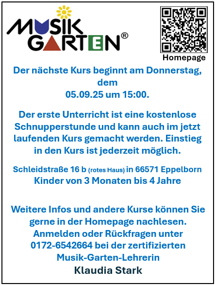 Ab Donnerstag den 05.09.2025 beginnt ein neuer Kurs Musik-Garten. Der erste Unterricht ist eine kostenlose Schnupperstunde.